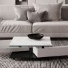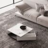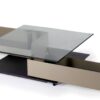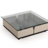 EXTENSIBLE SQUARE COCKTAIL TABLE WITH CERAMIC STONE AND PORCELAIN SELECTIONS OR GLASS TOP. BASE AND DRAWERS AVAILABLE IN PAINTED FINISHINGS. EQUIPPED WITH A MECHANISM FOR THE SYNCHRONIZED OPENING OF THE 2 DRAWERS.