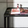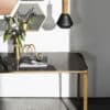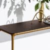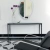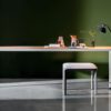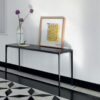 Console with four die-cast aluminium legs, polished chrome finish or lacquered, various finishes, and anodized or lacquered, various finishes, aluminium structure profile. Top available in tempered lacquered or frosted lacquered glass 8 mm th., various colours, or in Materia or ceramic, various finishes. The wooden top is available in the four legs version.