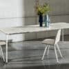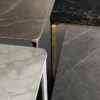 Extensible dining table with die-cast aluminium legs, polished chrome finish or lacquered, various finishes, and anodized or lacquered, various finishes, aluminium structure profile. Top available in tempered glass 8 mm th. lacquered or frosted lacquered, various colours, or in wood, ceramic or HPL. In the wooden version the extension is always in black HPL.