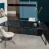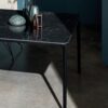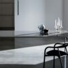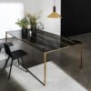 Dining table with die-cast aluminium legs, polished chrome finish or lacquered, various finishes, and anodized or lacquered, various finishes, aluminium structure profile. Tempered glass top, 8 mm th. lacquered or frosted lacquered, various colours. Top available also in MATERIA, ceramic, wood or HPL, various finishes.