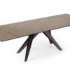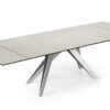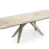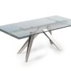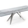 Extensible dining table, with top and extensions of glass. Base and track of chromed or painted metal. A very easy patented mechanism to pull out the lateral extensions allows the widening of the top of cm 80. Availabe also with ceramics tops.