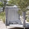 Useful during the day to shelter from the sunrays or to create a beautiful lounge area, or at night to admire the starry sky, Sunmoon is made entirely of recycled materials: hand-woven synthetic fibre, acrylic fabric to cover the upholstery and aluminium, which is solid yet extremely light.
