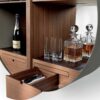 TAO BAR – Bar cabinet with painted metal structure painted in slate grey color. Back, partitions and drawers veneered in canaletto walnut. Right mirror back. Wooden shelves with leather insert.