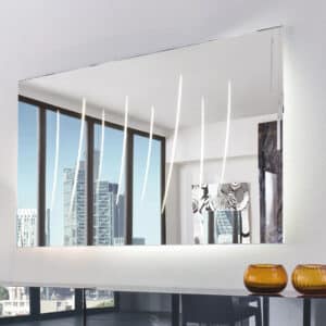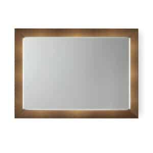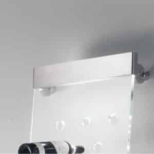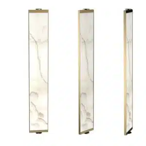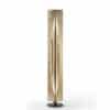 Floor lamp in extra clear curved glass 5 mm thick with gold leaf finish on swivel base in etched lacquered glass, creta colour. Metal support in brass finish. Vertical bar in burnished brass with LED STRIP