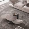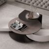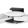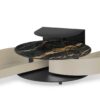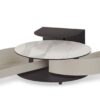 EXTENSIBLE ROUND COCKTAIL TABLE WITH CERAMIC STONE AND PORCELAIN SELECTIONS OR GLASS TOP. BASE AND DRAWERS AVAILABLE IN PAINTED FINISHINGS. PROVIDED WITH ADDITIONAL LATERAL SHELF AVAILABLE IN PAINTED FINISHINGS AND EQUIPPED WITH A MECHANISM FOR THE SYNCHRONIZED OPENING OF THE 2 DRAWERS.