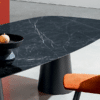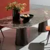Dining table with lacquered metal bases, various finishes. Tempered or laminated top in different materials and finishes. Upon request, with specific finishes, it is possible to customize the model for OUTDOOR use.