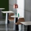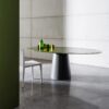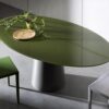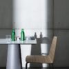 A mat stainless steel or lacquered metal base meets a top in glass, wood, ceramic or Materia, to make up a collection of tables with a distinctive personality and versatility in the setting: from the home to contract spaces.