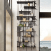 Bookcase with metal structure painted in titanium color. Veneered canaletto walnut or ash shelves.