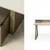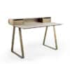 Desk with curved top covered in leather. Partitions in Canaletto walnut, Canaletto Henné or Bronze. Metal legs in Bronze finish. Optional wooden drawers and base in or brass, dark brass, titanium finish.