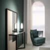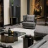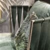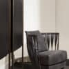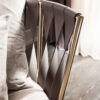 It is inspired by the world of luxury and glamour, from which it borrows details like the visible stitching and, above all, the characteristic twisted leather bands that envelop the metal structure. The back of the armchair is composed by leather or econabuk bands, twisted and handsewn with visible stitching. The base of the seat is in pantographed wood, padded with two densities of rubber and an upper layer in feathers. It is covered in fabric, velvet, leather or customizable with any fabric supplied by the customer.
