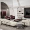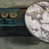 The base is in metal, available in the lacquered or coated variation. The top is available in wood, stone or marble and it’s distinguished by a see-though side, with a glass cover. On the rectangular, round and round-sofa coffee tables, as for the rest of the Valley collection, the iron base hugs the whole top.