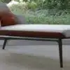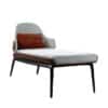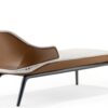 Chaise-longue with shell in resin and wood with upholstery in leather or fabric and internal back with quilting. Wooden base in shiny lacquered finish or in satin brass or titanium metallic finishes.