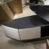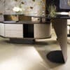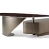 Desk with metal base in Bronze, Brass, Dark brass, Titanium finish. Shaped top in Marmoreflex/Legnoreflex with cable-hole. Adjustable side unit with 2 drawers with wooden structure matching the base and sides covered with leather.
