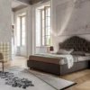 There is no possible way to mention Venice, without producing an homage to its magnificence. Veneziano is clearly an example of it: the headboard lifts up at the middle, almost like a building’s battlement. Handmade Chesterfield technique creates a Capitonné effect, both rich and refined. The bottom ring graciously meets the glorious headboard and its simple upholstery.