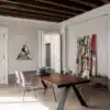 Ventaglio is an extendible console table, that can become a quite large dining table. The lacquered metal base is perfect for the wood covered tops. Matt white, matt black, or stone bronze bases perfectly match the Canaletto walnut, dark embossed oak and the matt white tops.